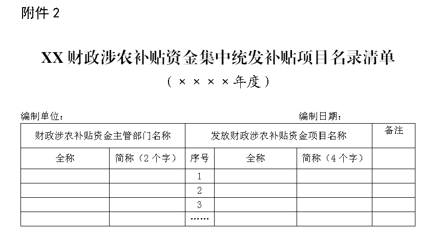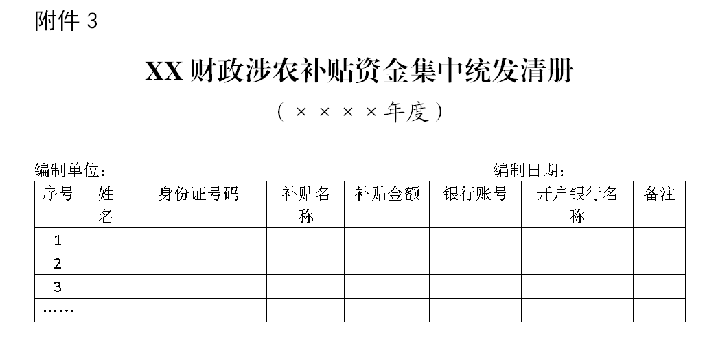 (二)各县财政涉农补贴资金主管部门要对照集中统发补贴项目名录,按照有关补贴政策规定精准核定各项补贴,对发放到农民群众的各项补贴张榜公示无误后,及时将包含补贴对象姓名、身份证号码、补贴名称、补贴金额、银行账号、开户银行名称等信息的“XX财政涉农补贴资金集中统发清册”(格式见附件3)提供财政部门,并对统发清册相关信息的合法性、合规性、真实性、准确性、完整性负责。