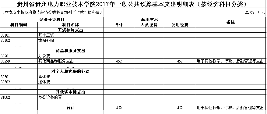 一般公共预算基本支出情况说明:我单位一般公共预算基本支出为452万元,全部属于公用经费,全部用于其他商品和服务支出,具体用于教学、行政、后勤管理等支出。