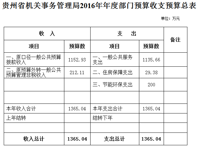 贵州省机关事务管理局2016年部门预算1365.04万元。包括:(1)一般公共预算支出1152.93万元,其中:基本支出342.43万元,占预算资金的25%;项目支出810.5万元,占预算资金的59%;(2)原预算外转一般公共预算管理非税收入安排支出212.11万元,占预算资金的16%。