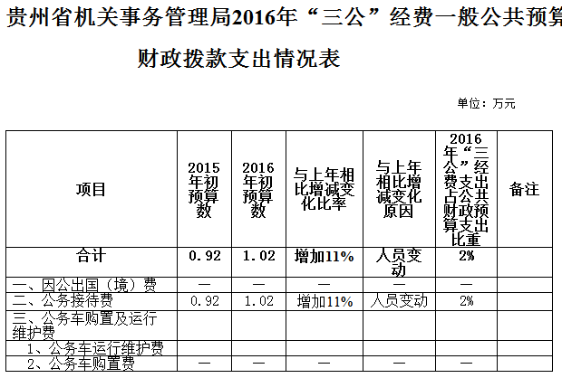 2016年部门预算中,“三公”经费预算为1.02万元,用于公务接待。为加强“三公”经费管理,按照国家和省“厉行节约”的相关要求,贵州省省本级因公出国(境)费、公务车购置费实行总额控制,年初未分配,年度间根据实际情况,按程序审批后分配到具体部门。