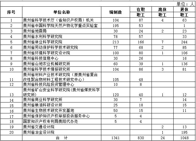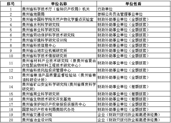 贵州省科学技术厅(省知识产权局)内设发展计划处、高新技术发展及产业化处等16个处室,下属19个单位。从预算单位构成看,部门预算单位由1个行政单位、1个参公执行事业单位、13个财政全额补助事业单位、3个财政差额补助事业单位、2个财政差额补助事业单位产权制度改革的企业,共20家独立法人构成。
