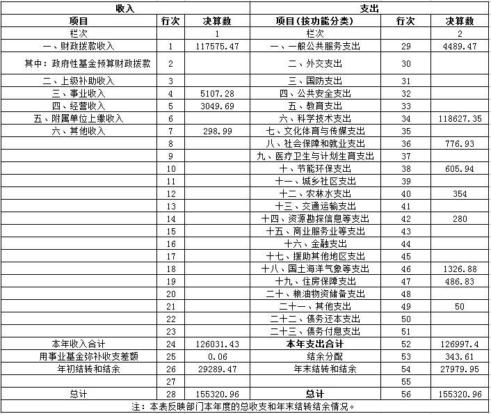 (1)本年收入为126031.43万元,与2014年相比,减少492.13万元, 降低0.39%。主要原因在于:一是一般公共预算财政拨款增加1213.12万元,其中主要在于“应用技术研究与开发专项”增加16240万元、“三区人才建设专项”增加632万元、调资增加2742万元、其它(生产力中心)50万元,共增加19664万元。基建专项减少3460万元、 “富民强县专项” 减少2170万元、“高层次创新人才培养专项” 减少770万元、农推资金减少1500万元、“创新基金专项”减少10574万元,共减少18474万元;二是2015年审计后,“预收账款”调整进“财政补助结转”,项目结转收入时不再由“预收账款”转“科研收入”,因此“事业收入”减少;三是利息作非税收入上缴,不作其他收入,其他收入减少。