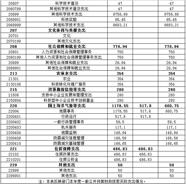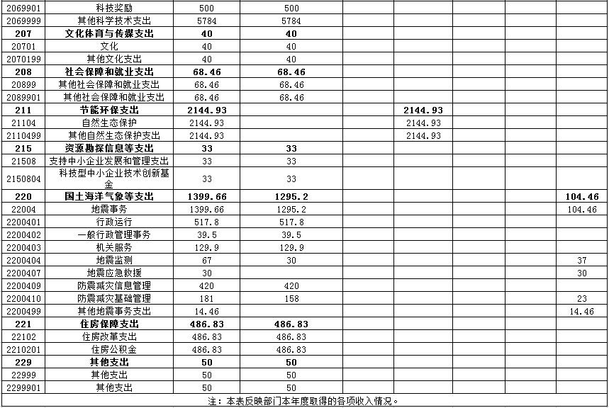 4、国土海洋气象等支出:反映国土资源气象等方面的支出,科学技术厅决算中主要涉及地震事务1个款级科目,反映地震事务方面的支出。