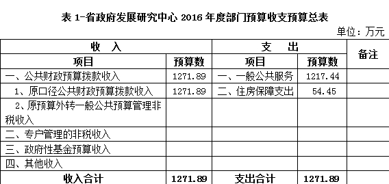 2016年,财政部门核定的收入和支出预算均为1271.89万元,均为省本级的财政预算拨款收入和支出。注:中心属于财政全额拨款单位,收入全部来自财政拨款,收支预算按年核定和使用,故收入和支出预算相等。具体情况见表1。