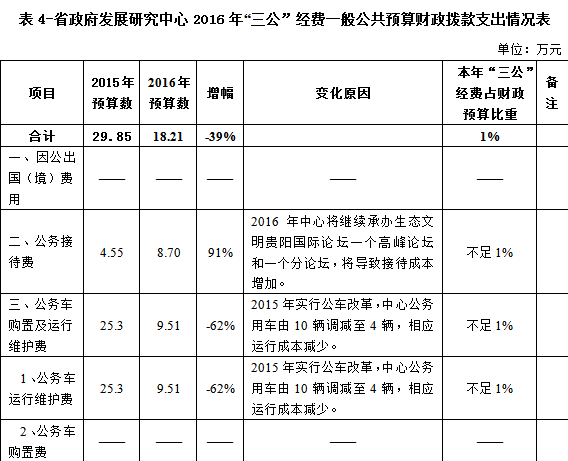 2016年,预计安排“三公”经费预算为18.21万元,较上年减少11.64万元,减幅为39%,其中,公务用车运行维护费9.51万元,公务接待费8.7万元,“三公”经费较上年减少的主要原因为:一是2015年实行公车改革,公务用车由10辆调减至4辆,相应公务用车运行成本大幅下降。二是2016年将承办生态文明贵阳国际论坛一个高峰论坛和一个分论坛,公务接待费增幅较大。另外,无法预计因公出国(境)费用和公务用车购置预算,主要原因为:一是财政部门对因公出国(境)费用和公务用车购置经费实行总额控制,年初无法细分,实际发生再行核定,年中追加,故未纳入年初预算。二是因公出国(境)任务均为参加国务院发展研究中心组团,2016年因公出国(境)计划待定。三是2015年实行公车改革后,近几年将不再发生公务用车购置情况。具体情况见表4。