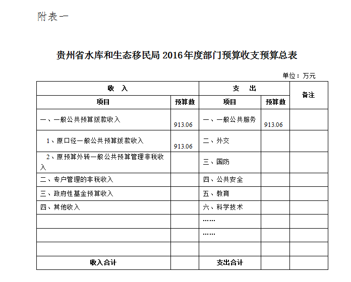 附件:1、贵州省水库和生态移民局2016年度部门预算收支预算总表