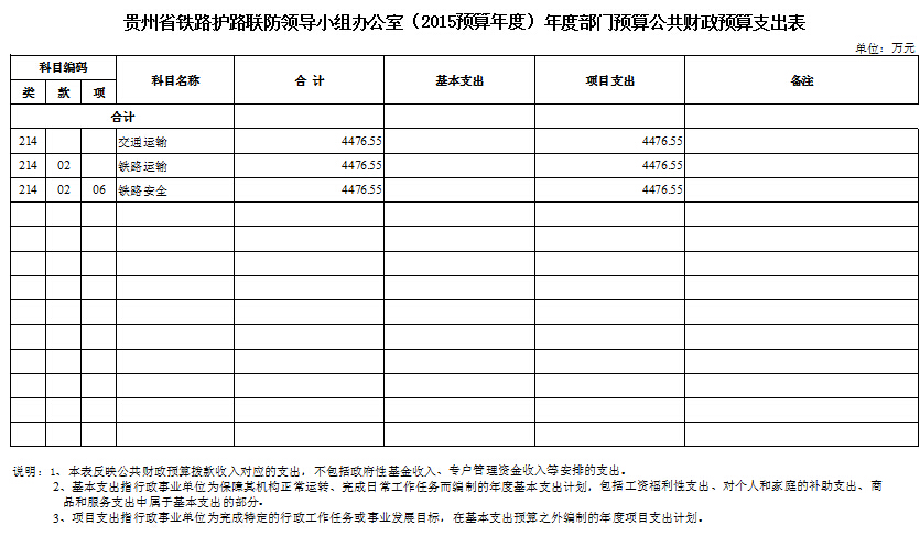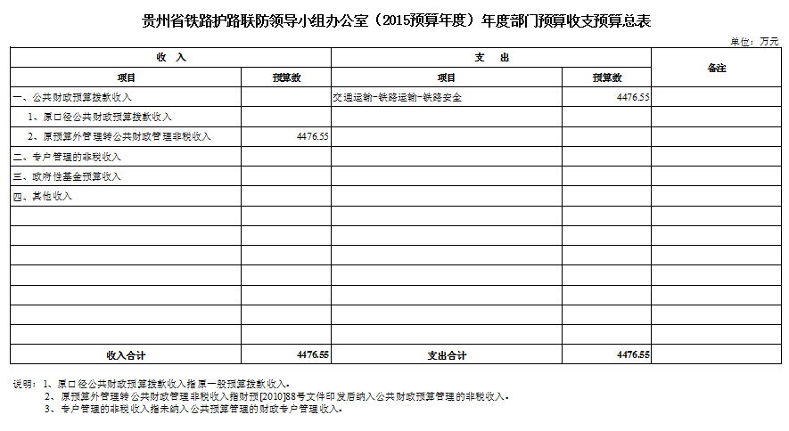 2、收入预算情况说明: 2015年省铁路护路办公共财政预算收入4476.55万元(省本级财政拨款收入4476.55万元)。包括:(1)原口径公共财政预算支出0万元,其中:基本支出0万元、项目支出0万元(省本级支出0万元、补助市县支出0万元); (2)原预算外转公共财政管理非税收入安排支出4476.55万元。
