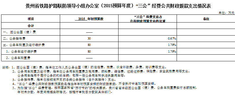 (2)部门预算“三公经费”情况。一是2015年公务用车运行费预算为80万元,2014年末共有公务用车51辆(含9个市(州)、48个县(市、区)护路办工作用车),平均每辆运行费1.57万元;二是为贯彻落实中央八项规定和省委“十项规定”,本着厉行节约、反对奢侈浪费的原则,2015年公务接待费预算为30万元(含未独立核算的10个市(州)、贵安新区护路办公务接待费);三是根据有关规定我办无因公出国(境)、无公务用车购置计划。