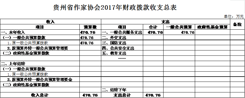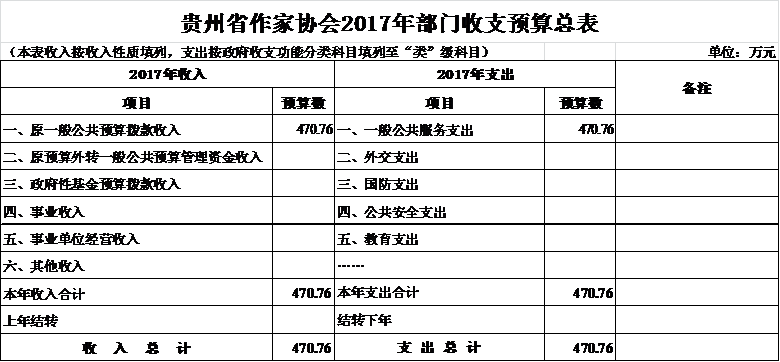 贵州省作家协会2017年财政拨款收入470.76万元。其中:原一般公共预算拨款470.76万元。贵州省作家协会为2017年新增预算单位,无上年结转资金。2017年支出470.76万元。其中,一般公共服务支出470.76万元。无结转下年资金。
