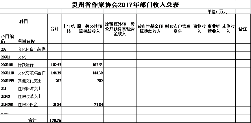 贵州省作家协会2017年收入470.76万元。其中:原一般公共预算拨款收入470.76万元。贵州省作家协会为2017年新增预算单位,无上年结转资金。2017年支出470.76万元。其中:一般公共服务支出470.76万元,无结转下年资金。