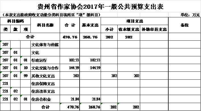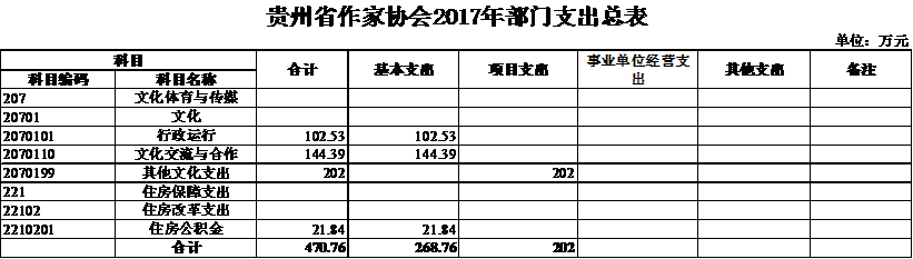 贵州省作家协会2017年一般公共预算支出470.76万元。基本支出268.76万元。其中:行政运行支出102.53万元;文化交流与合作支出144.39万元;住房公积金21.84万元。项目支出202万元。其中:省本级项目支出202万元。补助市县支出0元。