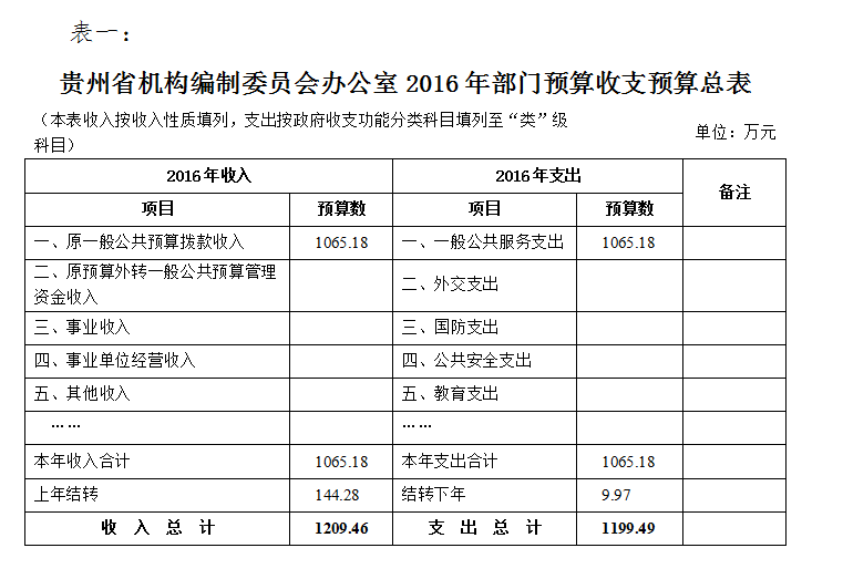 一、贵州省机构编制委员会办公室2016年部门预算收支预算总表