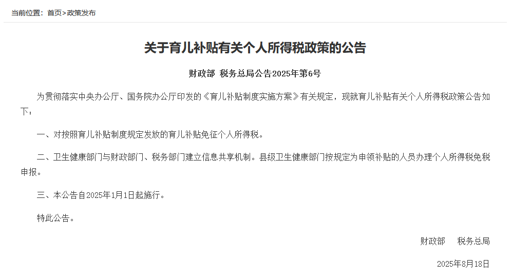 财政部 、税务总局日前发布公告,对按照育儿补贴制度规定发放的育儿补贴免征个人所得税。公告如下: